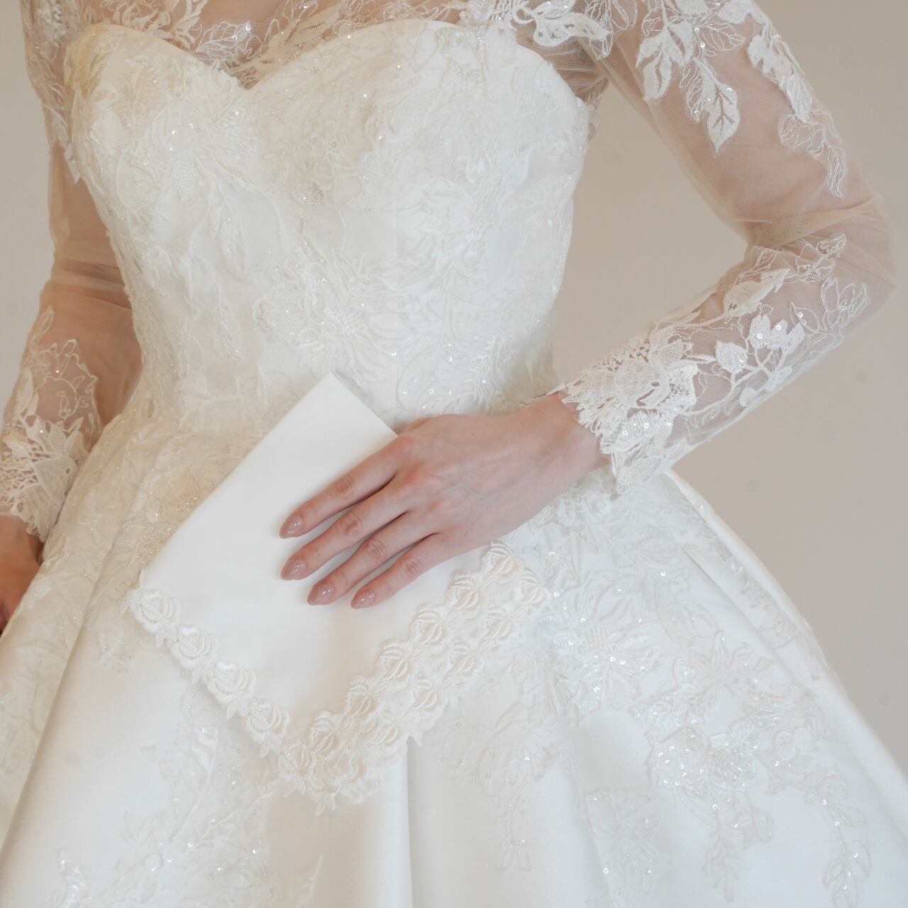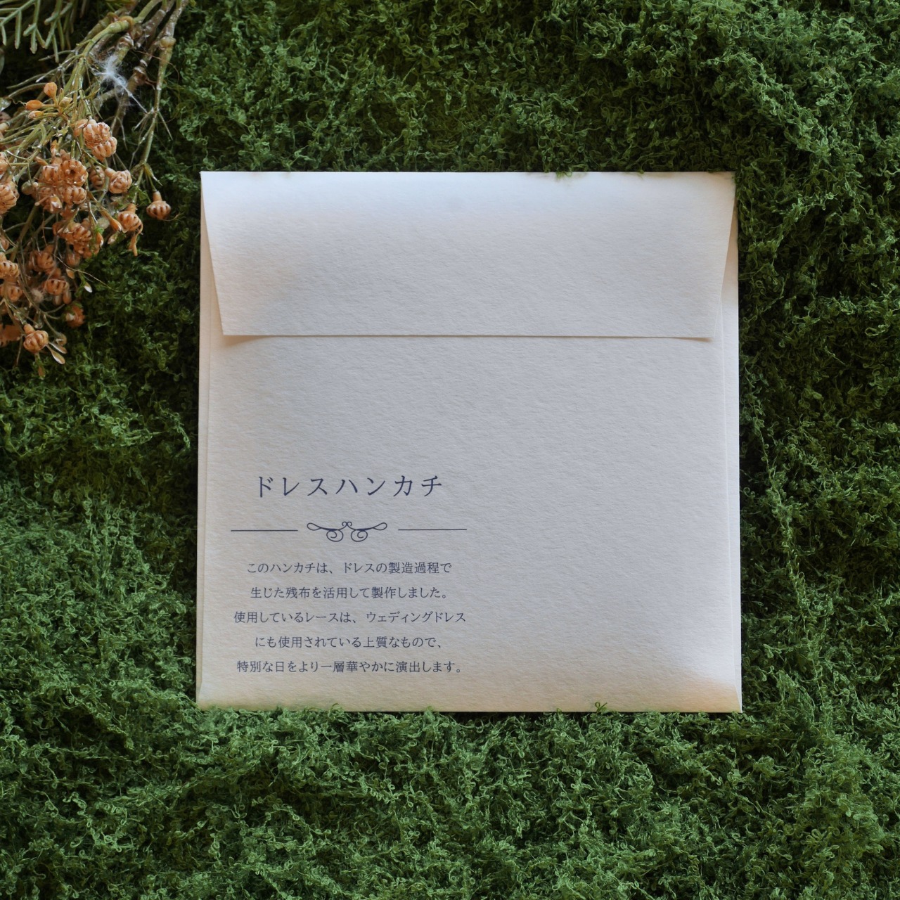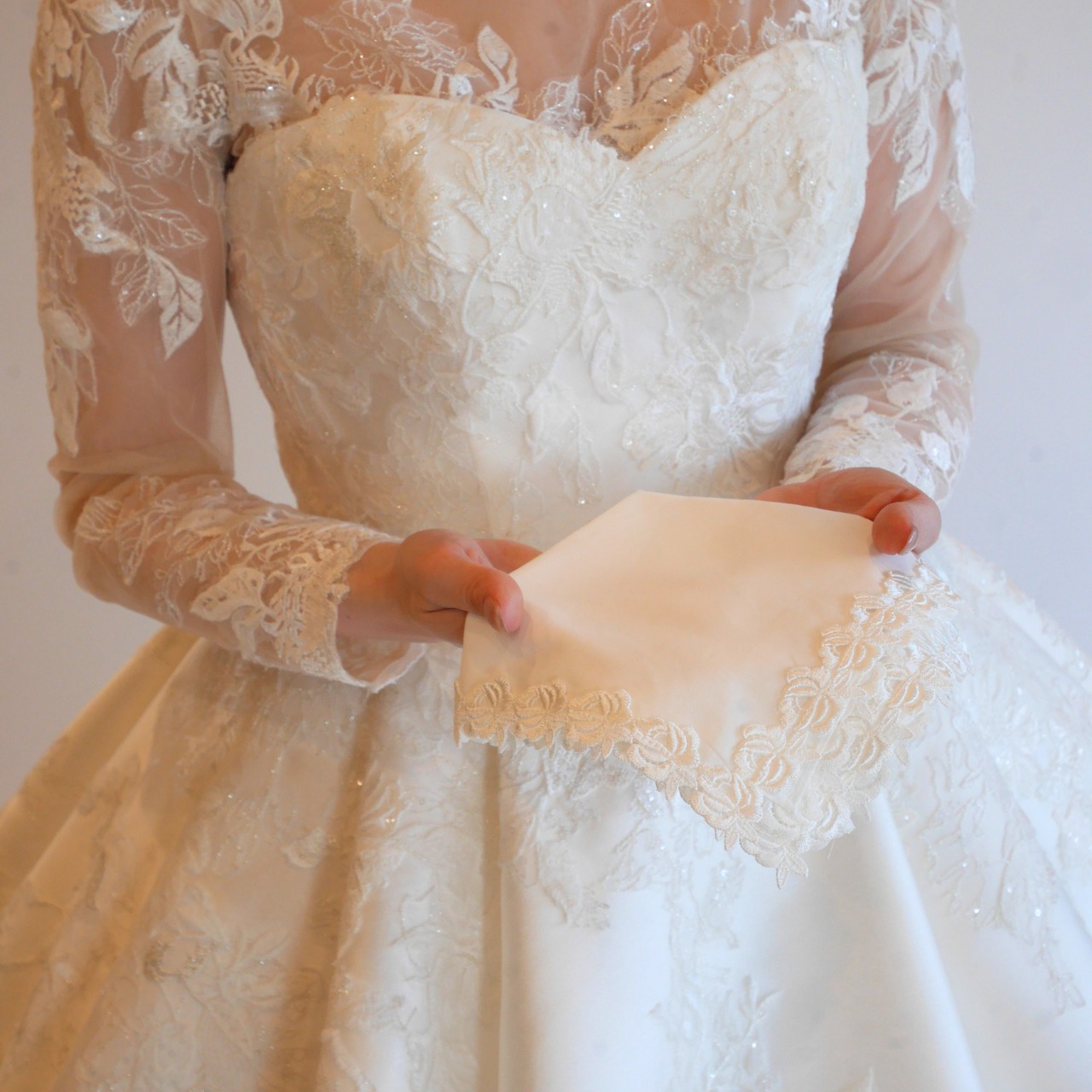 ハレの日のアイテムをお探しの方、大切な方へのプレゼントをお探しの方、日常を上品にしたい方におすすめのレースハンカチです。ウェディングドレスに施された細やかなレースを贅沢に使用しており、フォーマルな場にふさわしい高級感を演出します。花嫁自身の必須アイテムとしてお使いいただくのはもちろん、ゲストとしての参列時も、ご両親へのプレゼントにもおすすめです。32cmの大きめサイズでたくさん涙を拭ってくれます。