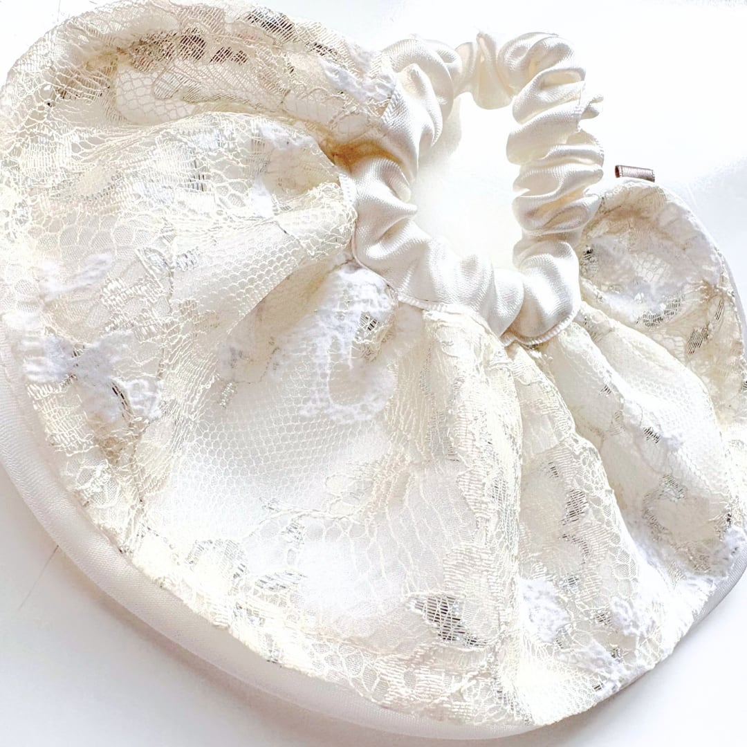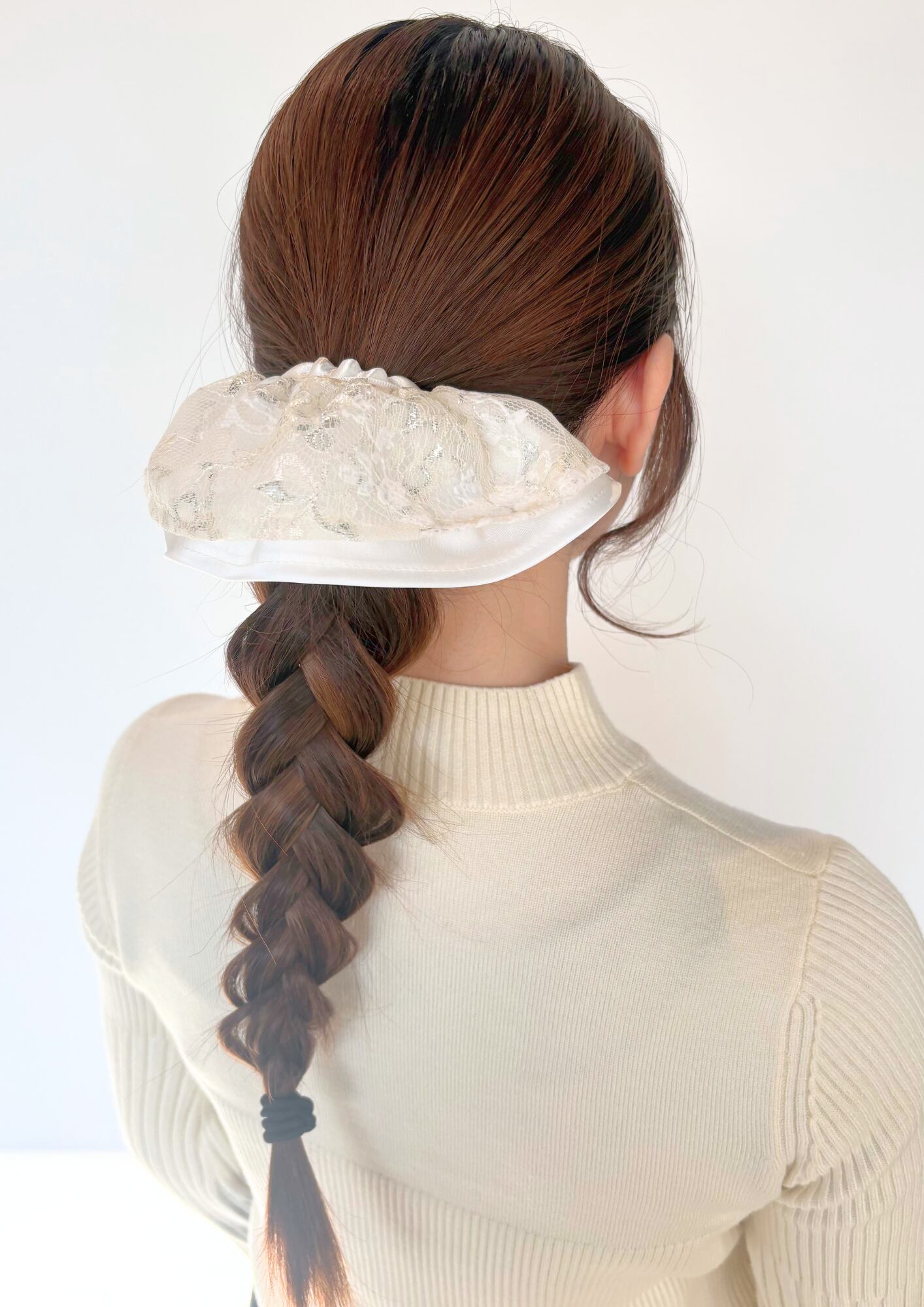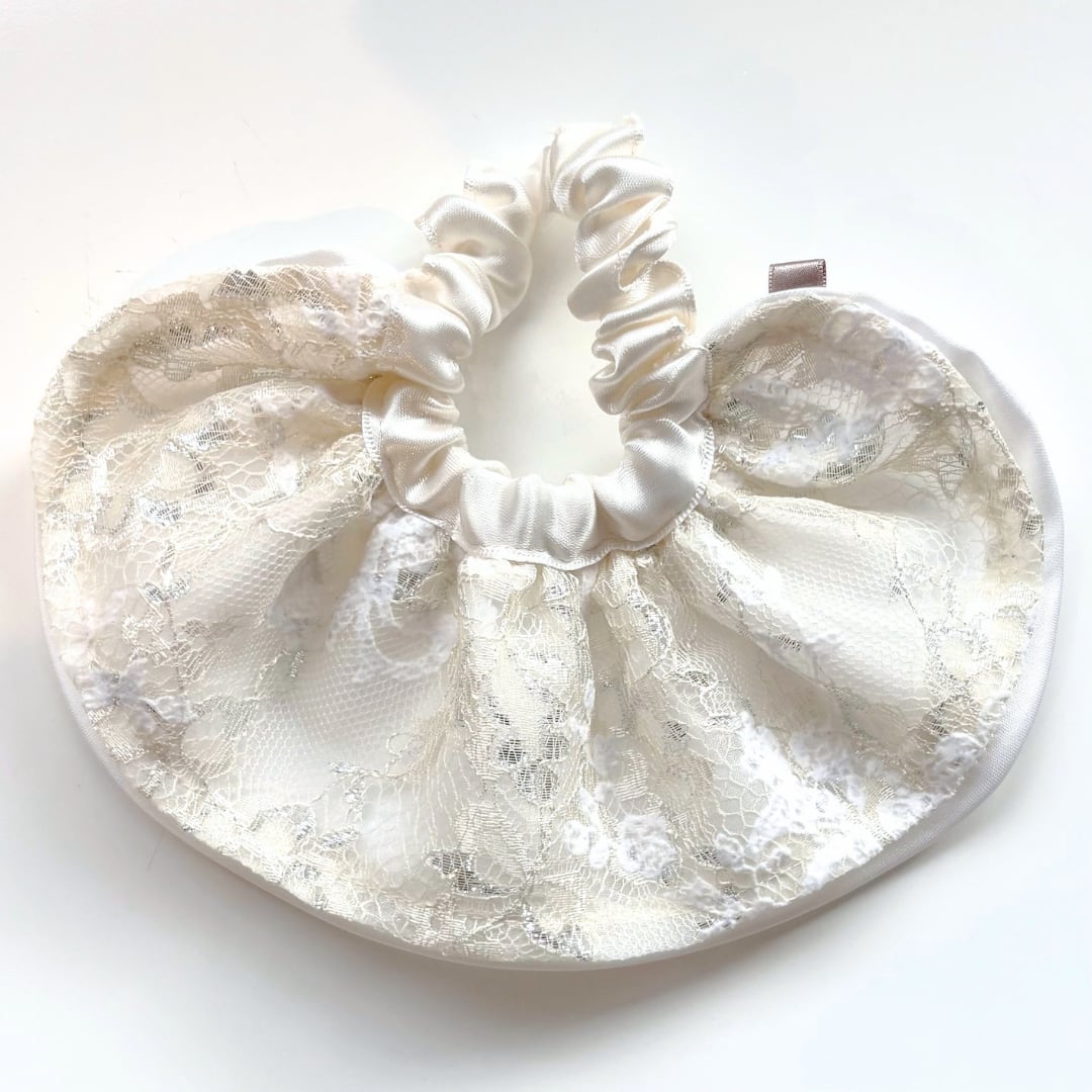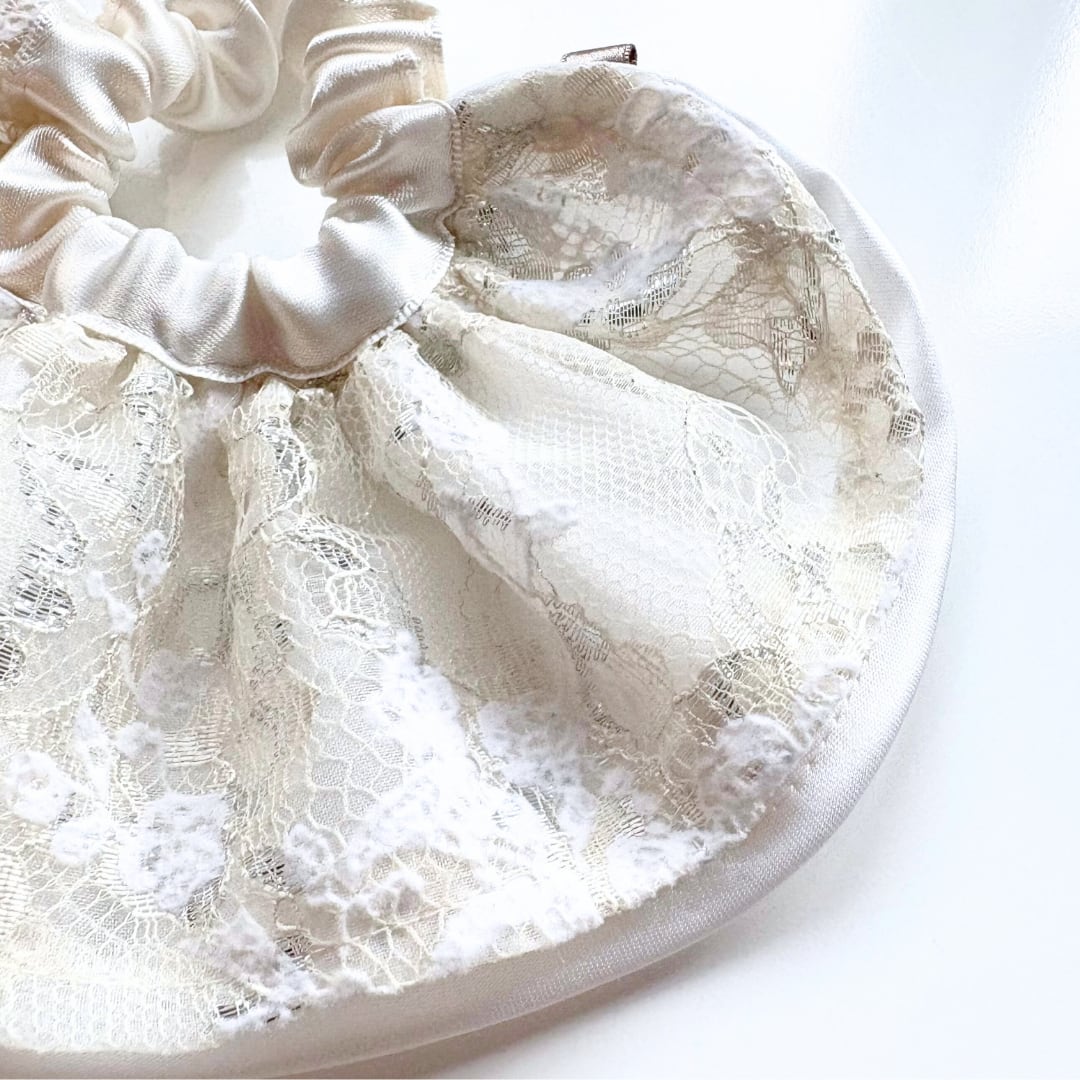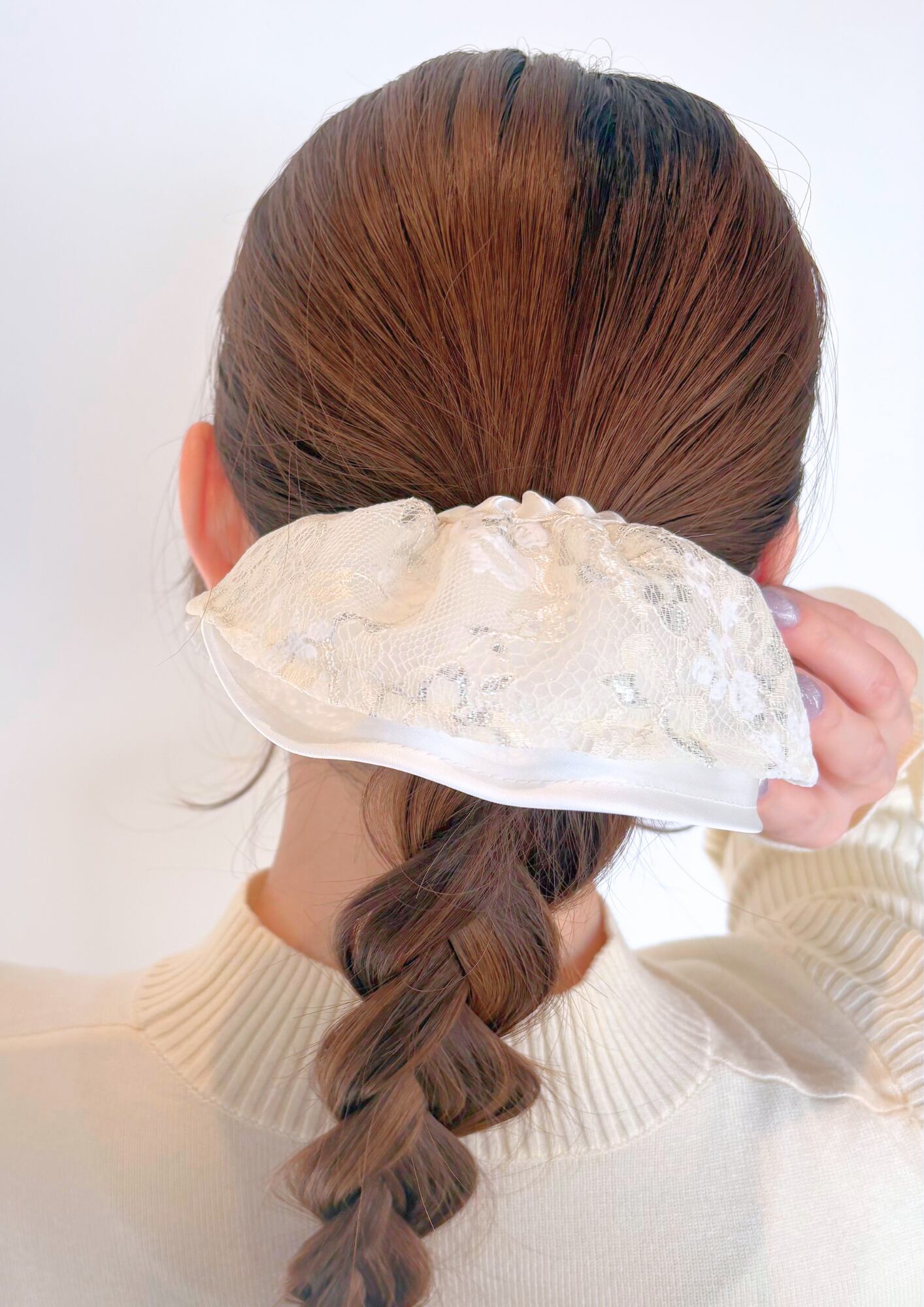 少し変わったアクセサリーをお探しの方や、流行に敏感なおしゃれさんにおすすめのスカートシュシュです。通常のシュシュとは異なり、くくったゴムの部分から垂れ下がるデザインで、一気におしゃれでかわいらしい印象に。ウェディングドレスのスカートのように、着用したときに美しく広がるよう、形・サイズ・生地までこだわりました。華やかなレースにフロッキー加工を施した、ドレス生地ならではの希少なデザインです。