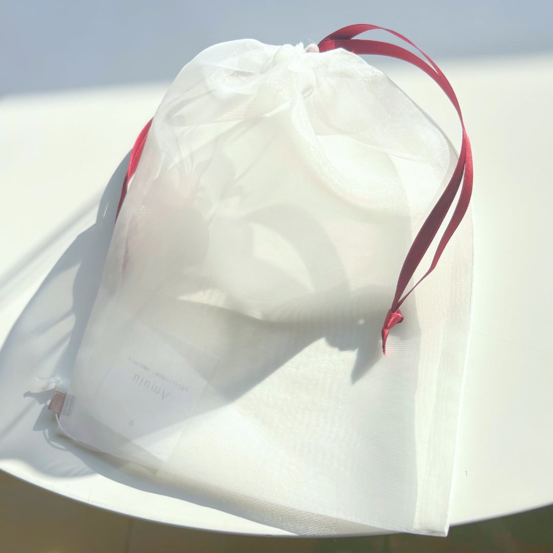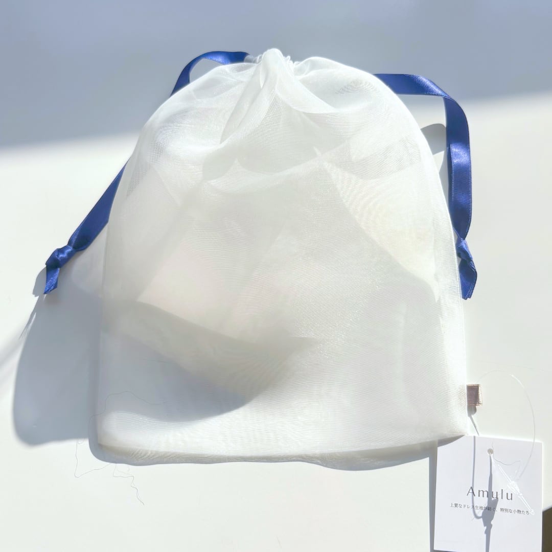 日常アイテムにもこだわりたい方や、プチギフトとしても喜ばれる巾着です。巾着本体の生地からサテン紐にいたるまで、すべてウェディングドレスに使用していた素材を贅沢に使用。毎日の中で、さりげなくドレスの上質さを感じていただけます。