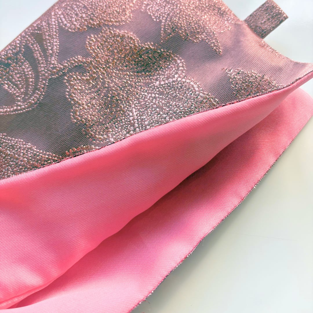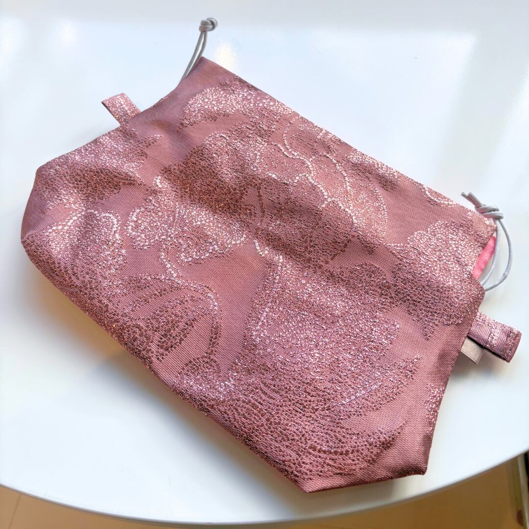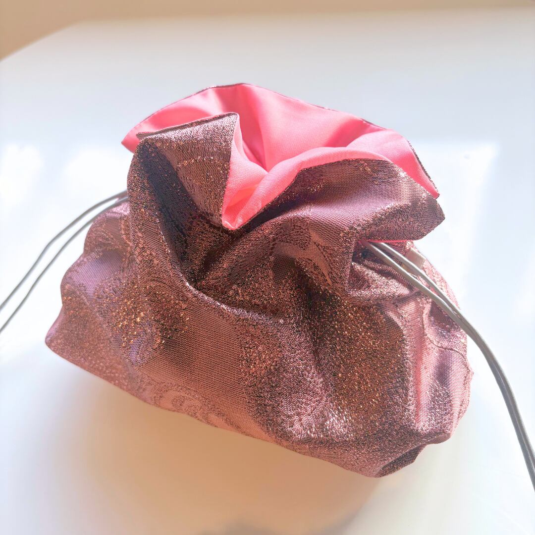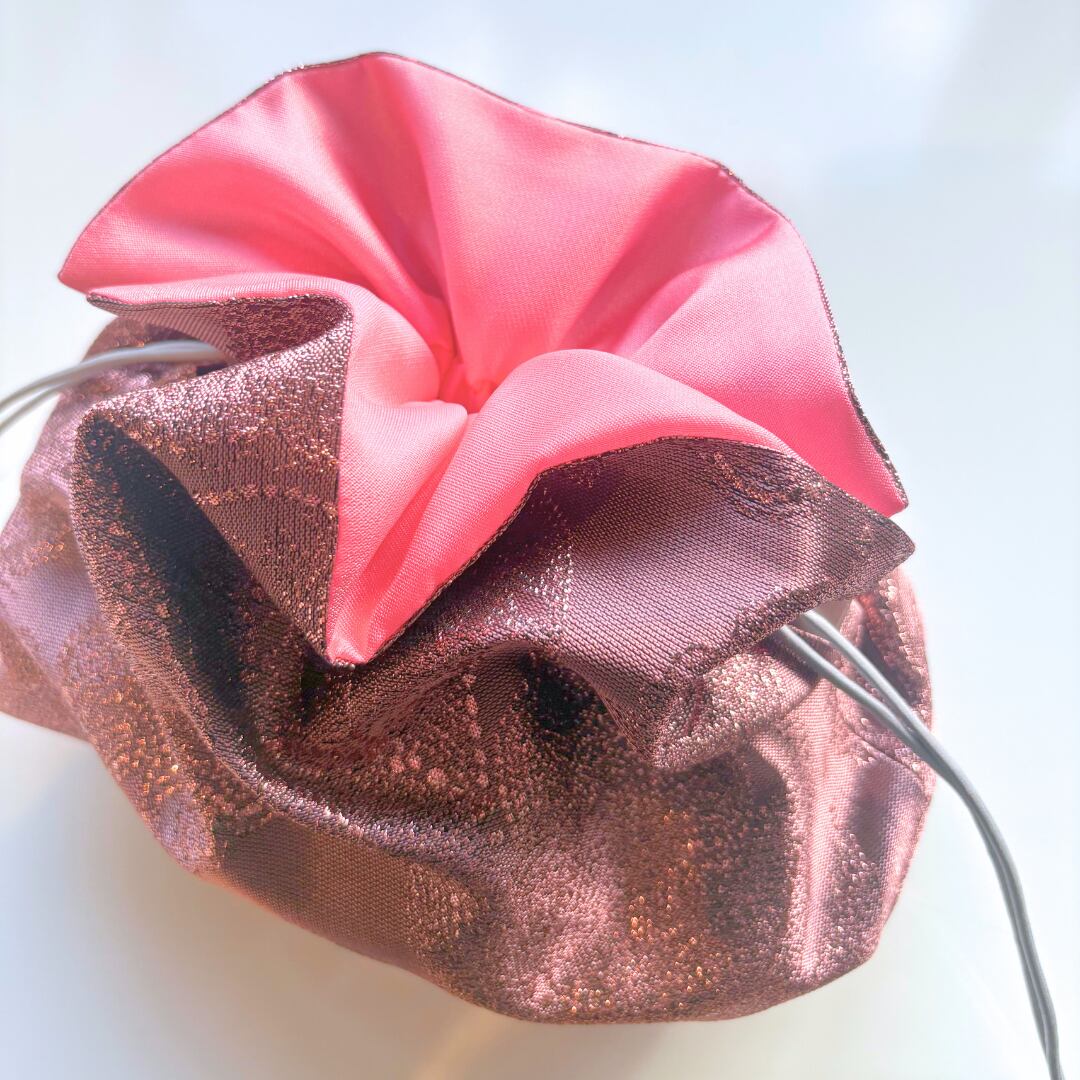 立体的なフォルムが自然に生まれるデザインで、置いているだけでも絵になる存在感。やわらかなで上質な生地で、華やかさと上品さを両立しています。口元にはサテン生地を使用し、開け閉めのたびにふわっと広がる表情が魅力的。コスメやアクセサリー、小物をまとめるのにちょうど良いサイズ感で、収納ポーチ中でもパッと目を引きます。お持ちのショルダーストラップを付ければショルダーバックとしてもお使いいただけます。ふんわりと“ぽわん”としたシルエットが愛らしいデザインで、人と被らないデザインを楽しみたい方や少し特別な日常アイテムを取り入れたい方におすすめの巾着です。ギフトとしても喜ばれる、優雅で可愛い一品。