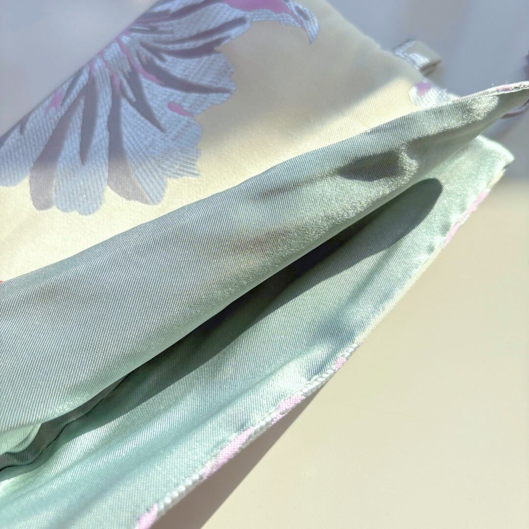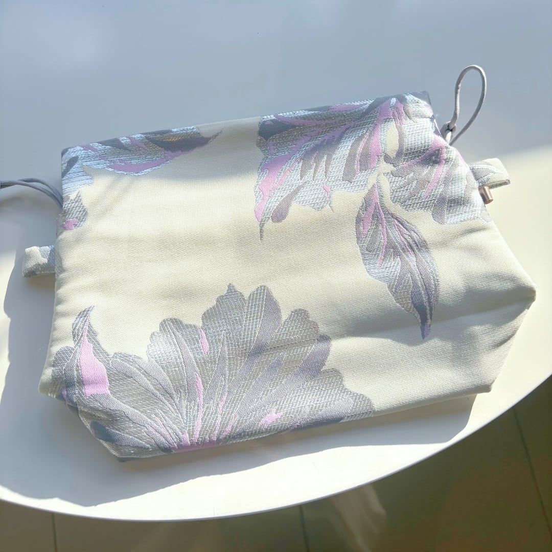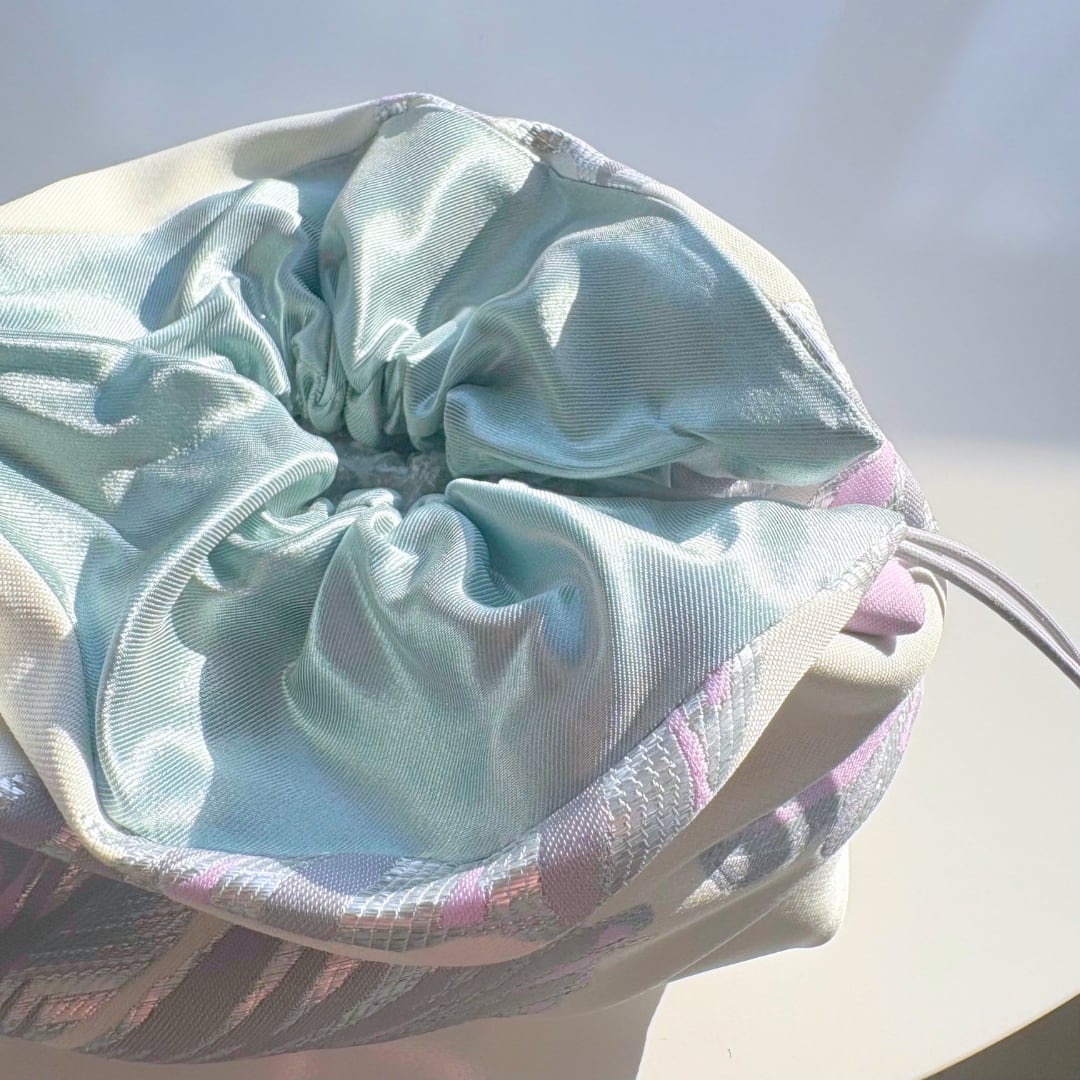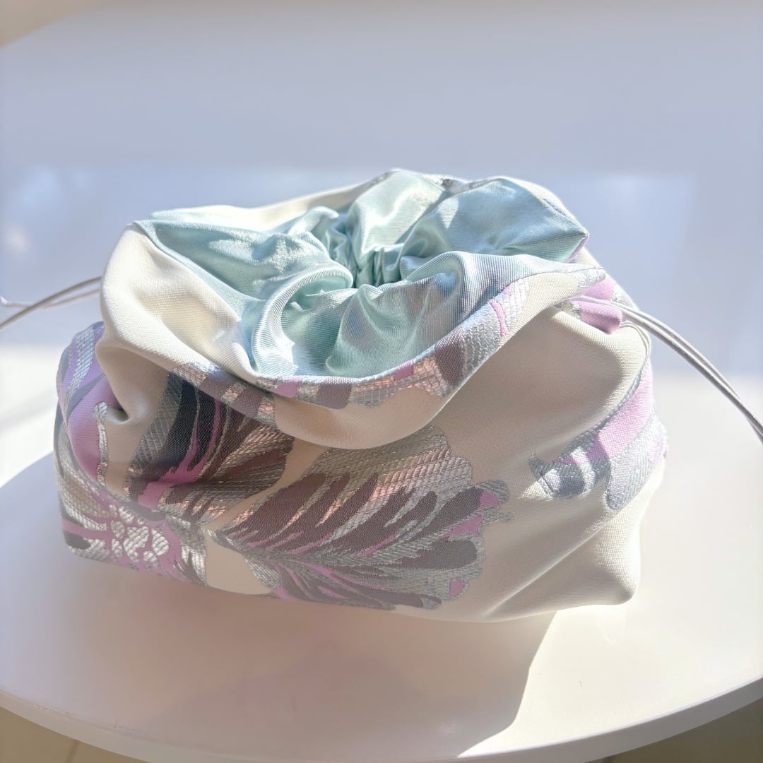立体的なフォルムが自然に生まれるデザインで、置いているだけでも絵になる存在感。やわらかなで上質な生地で、華やかさと上品さを両立しています。口元にはサテン生地を使用し、開け閉めのたびにふわっと広がる表情が魅力的。コスメやアクセサリー、小物をまとめるのにちょうど良いサイズ感で、収納ポーチ中でもパッと目を引きます。お持ちのショルダーストラップを付ければショルダーバックとしてもお使いいただけます。ふんわりと“ぽわん”としたシルエットが愛らしいデザインで、人と被らないデザインを楽しみたい方や少し特別な日常アイテムを取り入れたい方におすすめの巾着です。ギフトとしても喜ばれる、優雅で可愛い一品。
