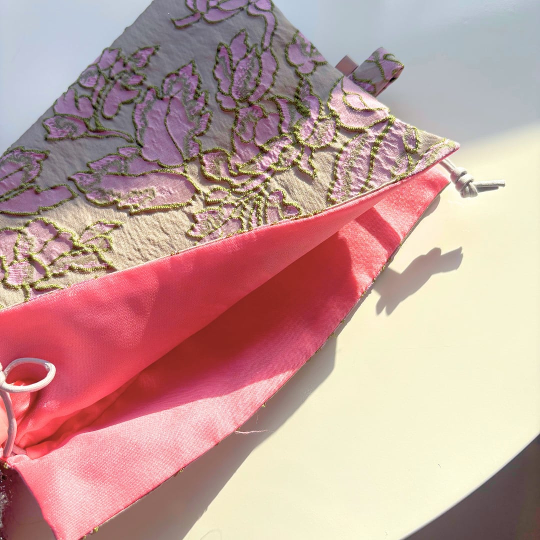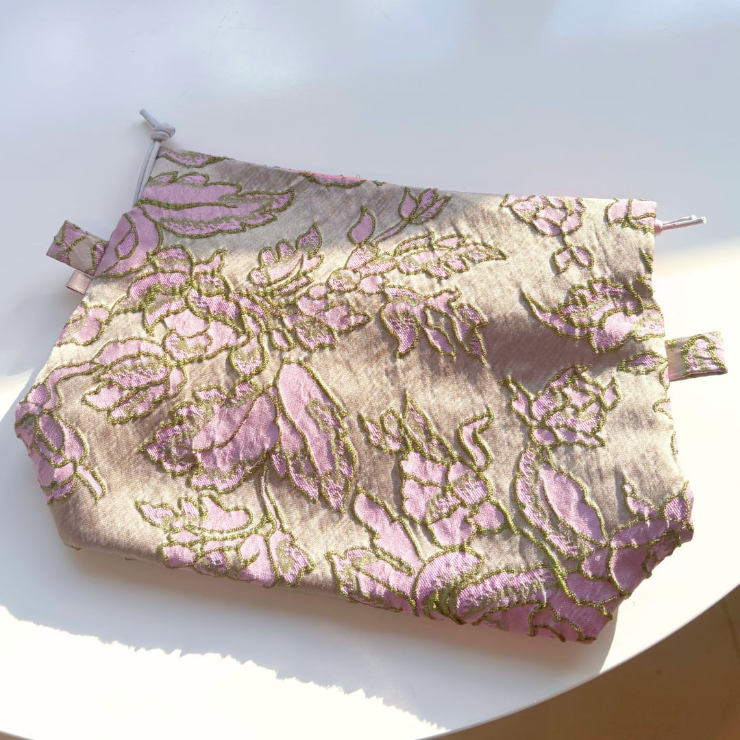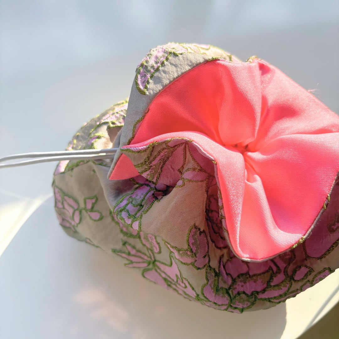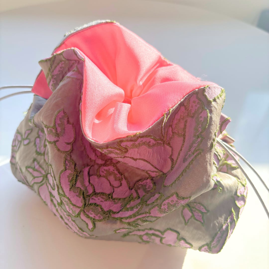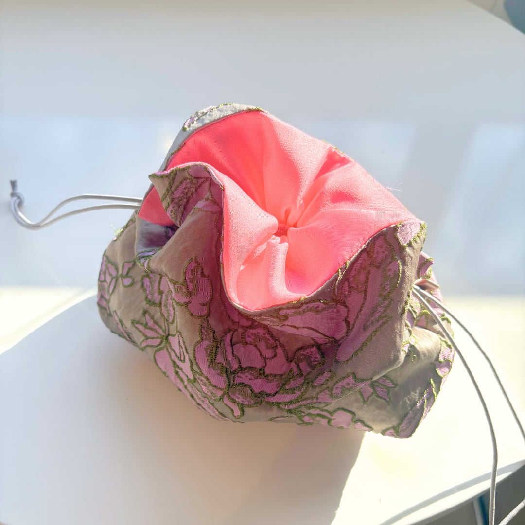 立体的なフォルムが自然に生まれるデザインで、置いているだけでも絵になる存在感。やわらかなで上質な生地で、華やかさと上品さを両立しています。口元にはサテン生地を使用し、開け閉めのたびにふわっと広がる表情が魅力的。コスメやアクセサリー、小物をまとめるのにちょうど良いサイズ感で、収納ポーチ中でもパッと目を引きます。お持ちのショルダーストラップを付ければショルダーバックとしてもお使いいただけます。ふんわりと“ぽわん”としたシルエットが愛らしいデザインで、人と被らないデザインを楽しみたい方や少し特別な日常アイテムを取り入れたい方におすすめの巾着です。ギフトとしても喜ばれる、優雅で可愛い一品。